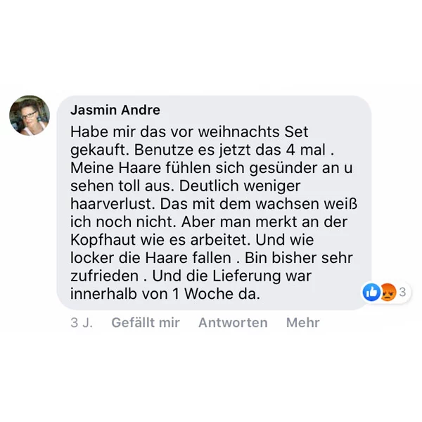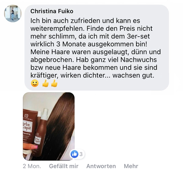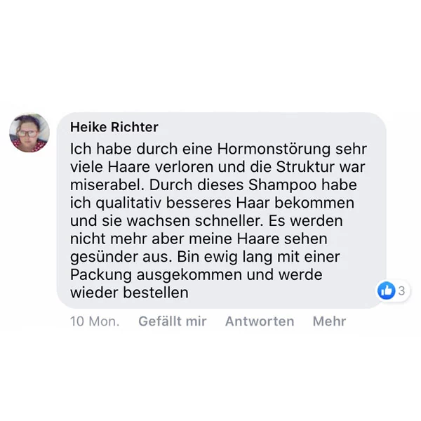 Shampoo: Tragen Sie eine haselnussgroße Menge des Shampoos alle 2 oder 3 Tage auf dem feuchten Haar auf. Schäumen Sie das Shampoo auf, in dem Sie es ganz sanft ohne zu reiben auf Ihrer Kopfhaut einmassieren. Lassen Sie das Produkt 3 bis 4 Minuten lang einwirken und spülen es danach mit lauwarmem Wasser wieder aus.