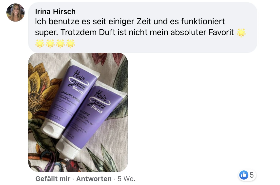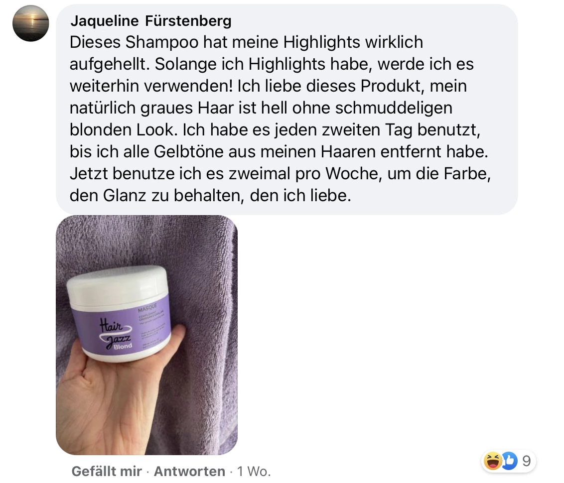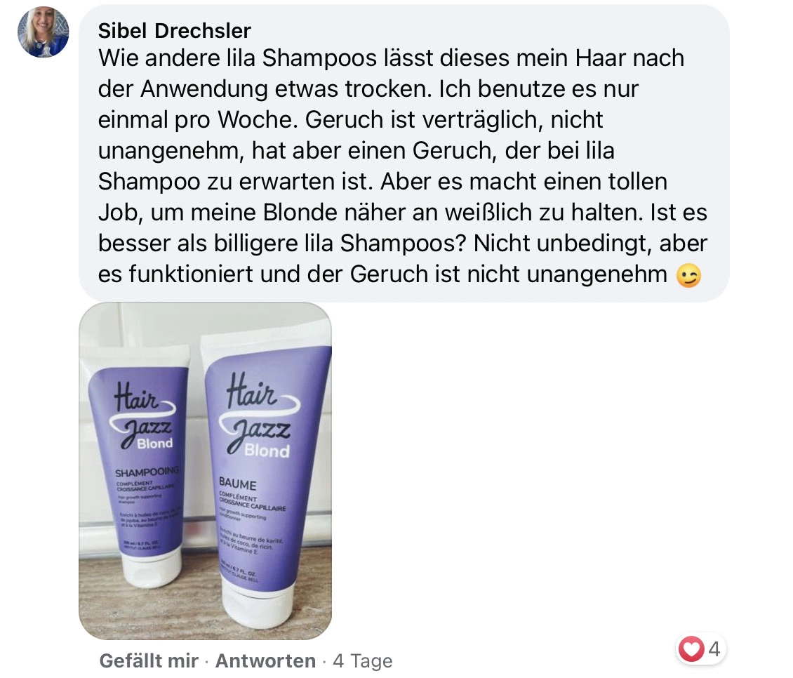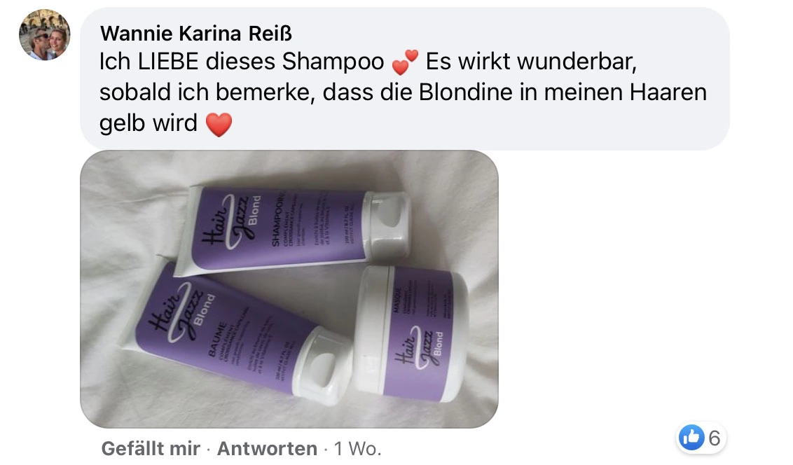 HAIR JAZZ Blond Shampoo (200ml): haare anfeuchten. Das Shampoo auftragen und es gleichmäßig im Haar verteilen. Sanft in die Kopfhaut einmassieren. Haare gründlich mit warmem Wasser ausspülen und den Vorgang bei Bedarf wiederholen. Tragen Sie das Shampoo 2 bis 3 Mal pro Woche auf. Kontakt mit den Augen vermeiden. Produkt nur zur äußerlichen Anwendung.