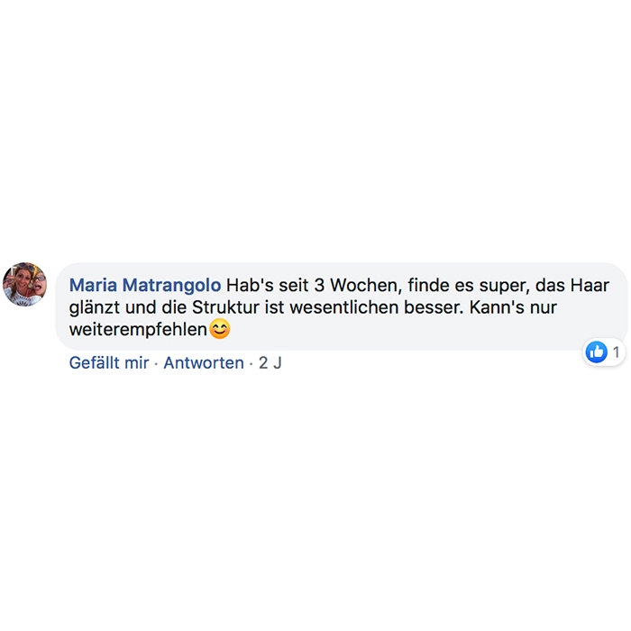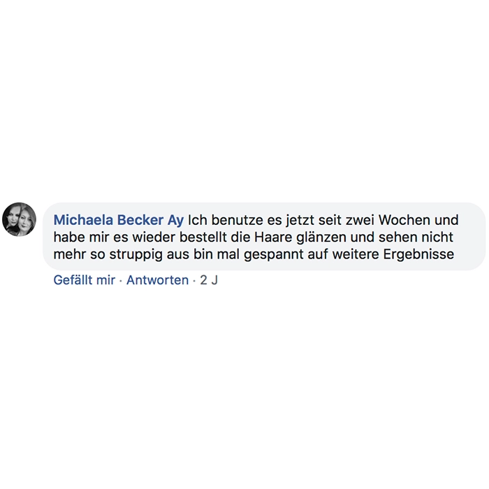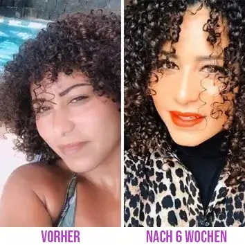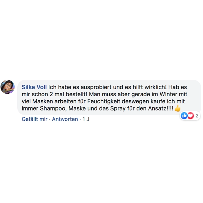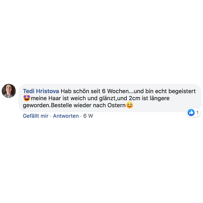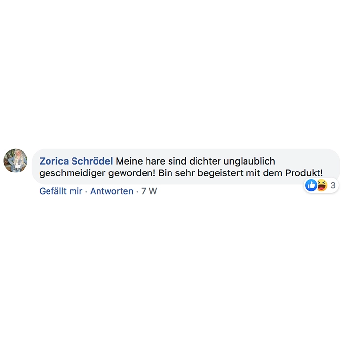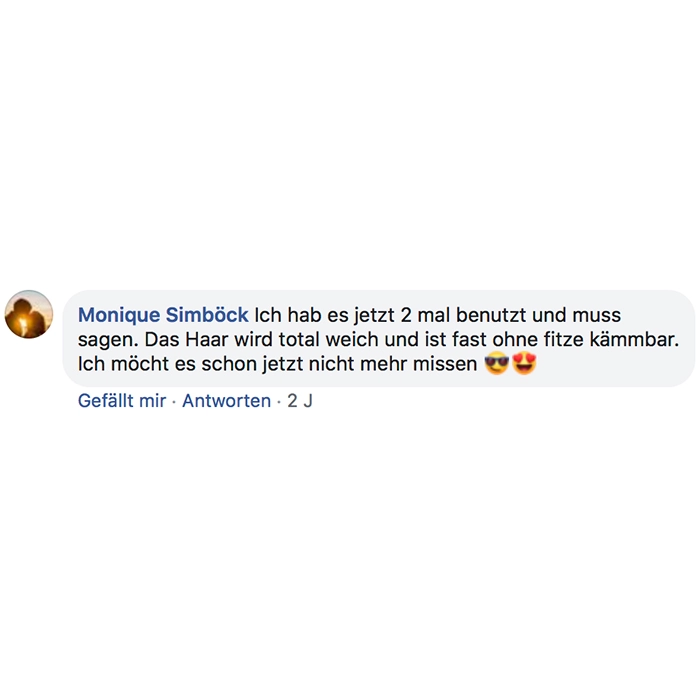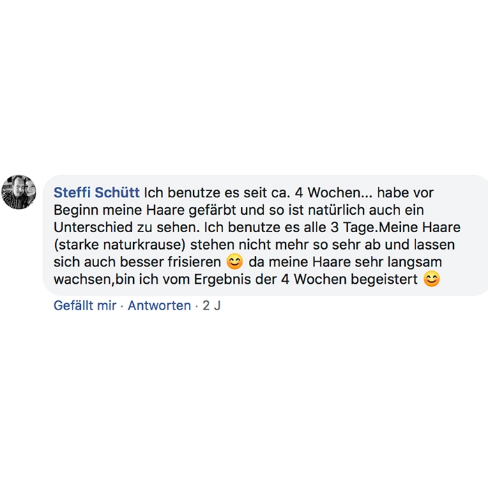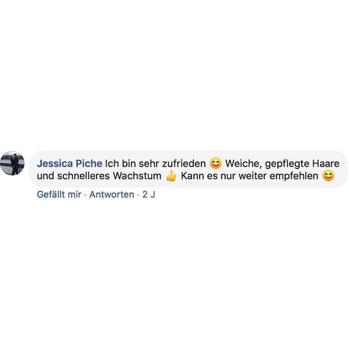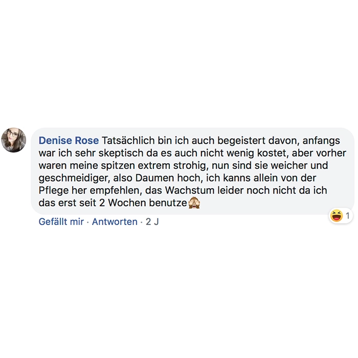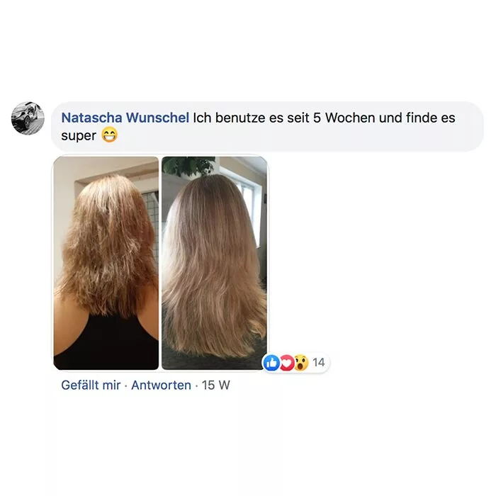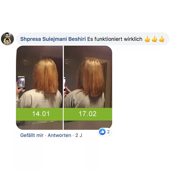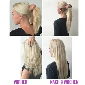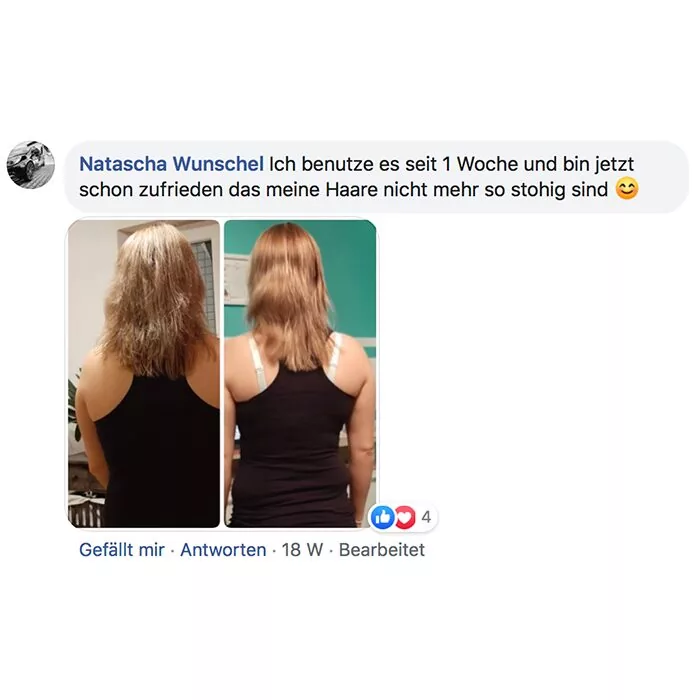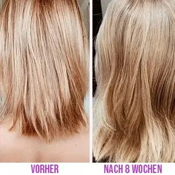 Die Wirkstoffe Sojaprotein, Vitamin B6, Keratin, Eierschalenextrakt und Chitin nähren die Haarfollikel, fördern das Haarwachstum, verbessern die natürliche Glätte und das natürliche Volumen und helfen, Spliss zu vermeiden.