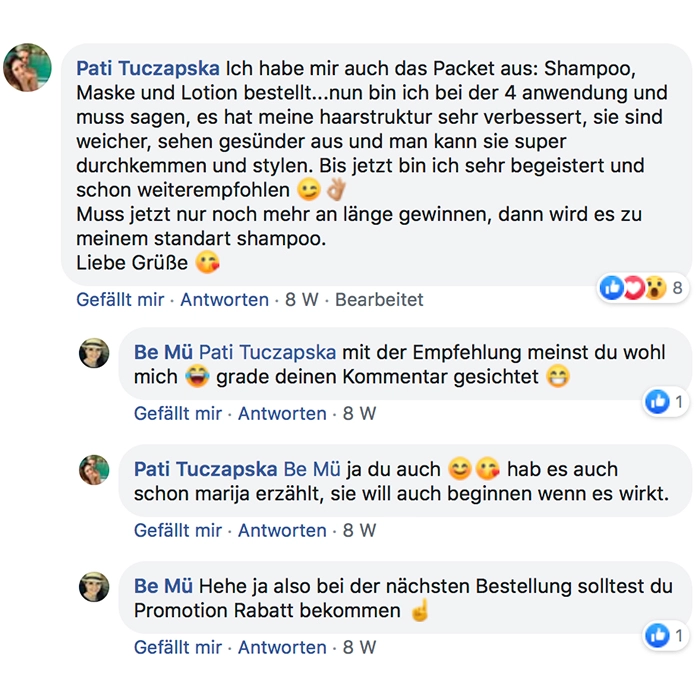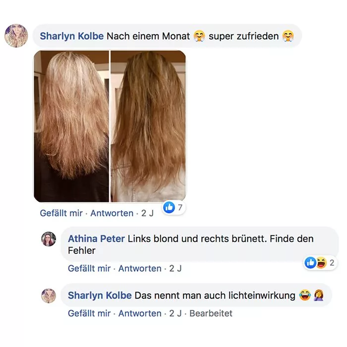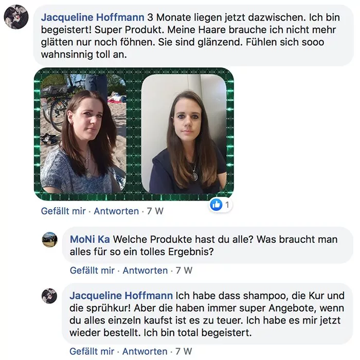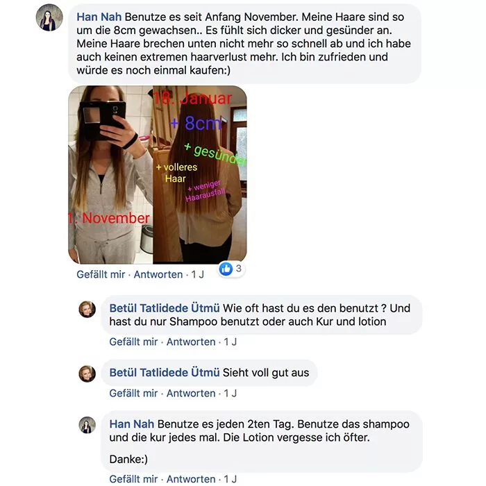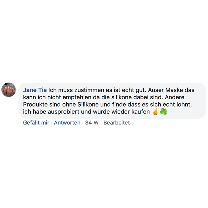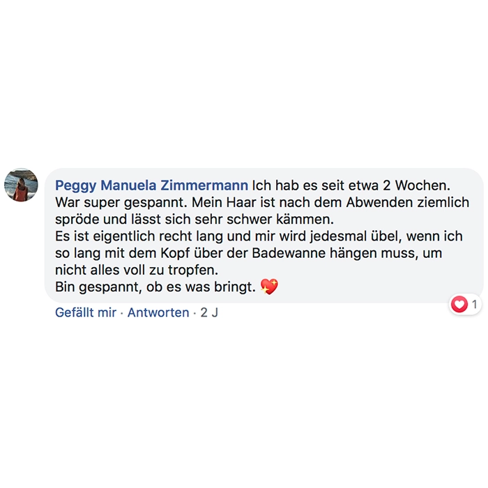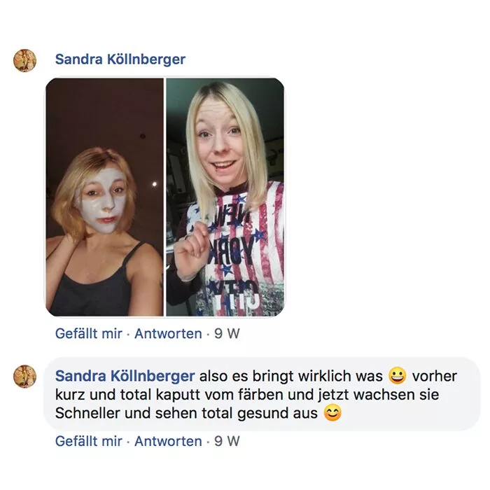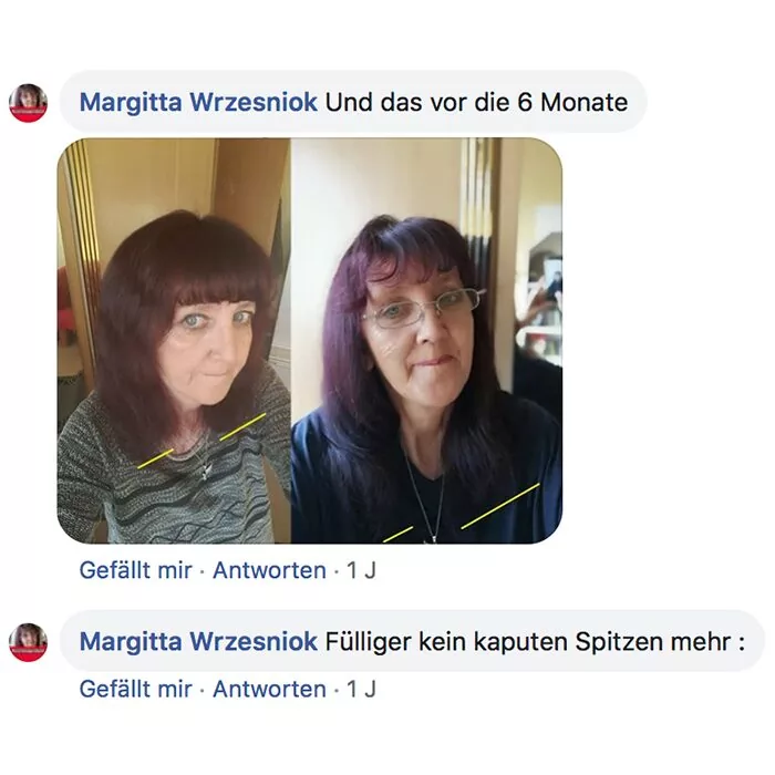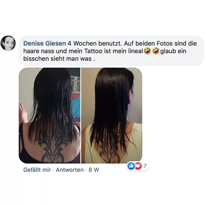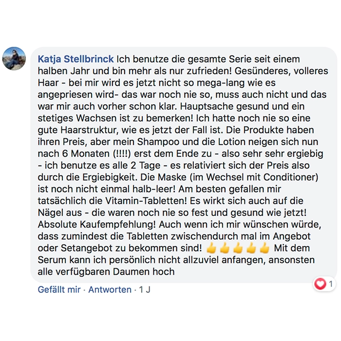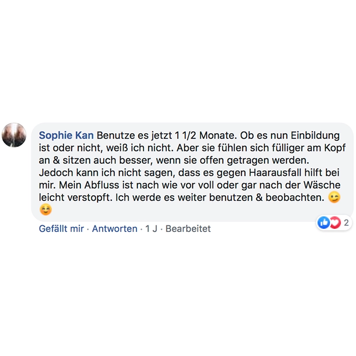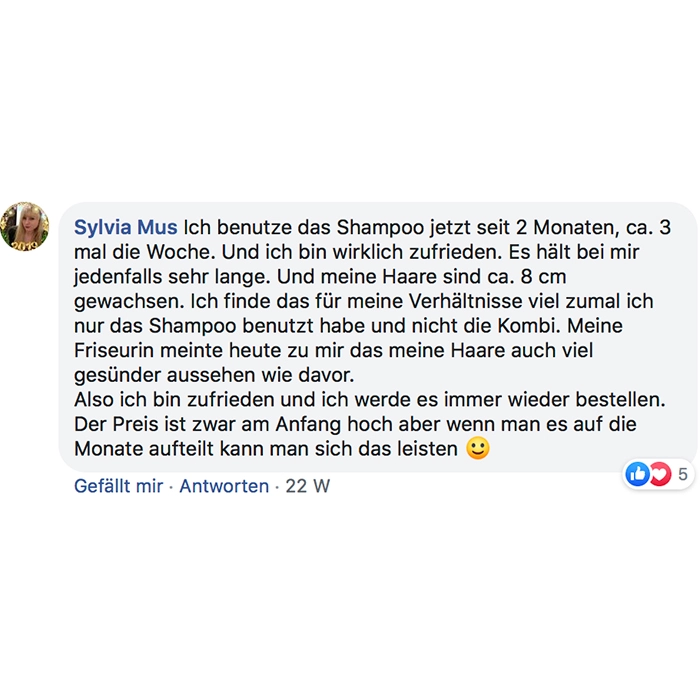 Die Wirkstoffe Sojaprotein, Vitamin B6, Keratin, Eierschalenextrakt und Chitin nähren die Haarfollikel, fördern das Haarwachstum, verbessern die natürliche Glätte und das natürliche Volumen und helfen, Spliss zu vermeiden.